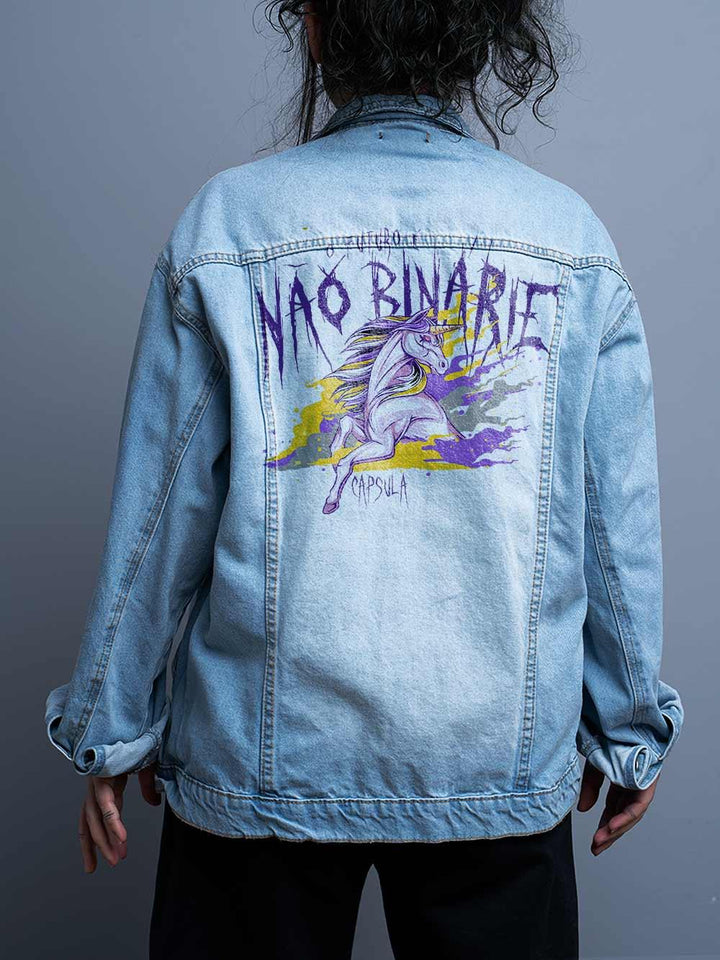 Cadê a jaqueta jeans das não-bináries? Aqui na collab da Belle Belinha com a Cápsula, obviamente <3